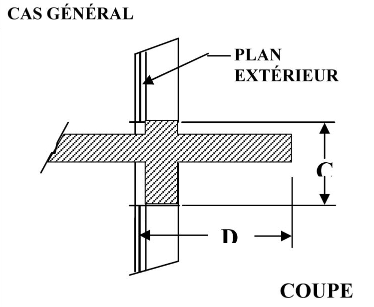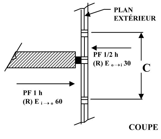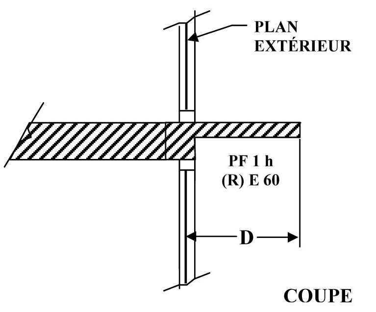 Sont susceptibles de participer à l'indice D (figure 3) les éléments pare-flammes de degré 1 h ou E60 (RE60 si porteur). Pour les bâtiments dans lesquels le degré de résistance au feu des planchers exigé est inférieur à 1 h, il convient de retenir pour l'élément en avancée la même exigence. Les avancées en béton armé, justifiées pour le degré requis, répondent à cette exigence.