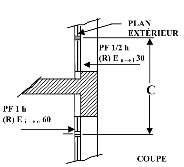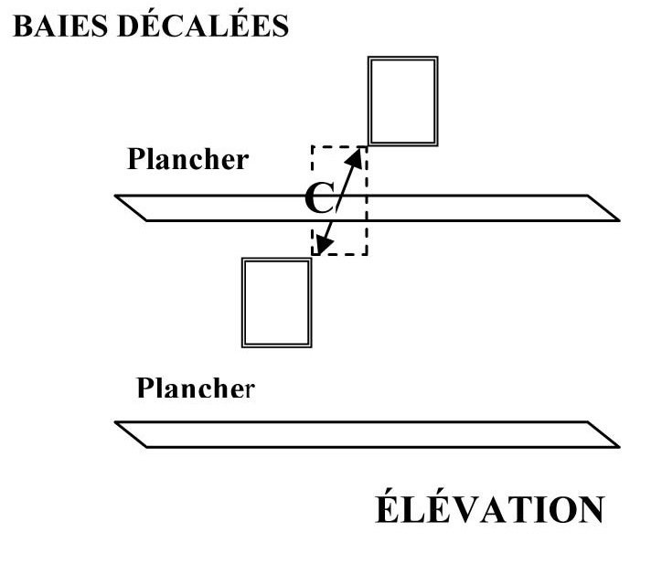 C : distance verticale égale soit à la valeur telle que définie sur la figure 1a, soit à la valeur de l'indice caractéristique déterminé suivant l'arrêté du 10 septembre 1970 (essai LEPIR 2). Lorsque les baies vitrées ne sont pas superposées, le C se mesure selon la distance la plus courte entre ces baies (figure 1b).