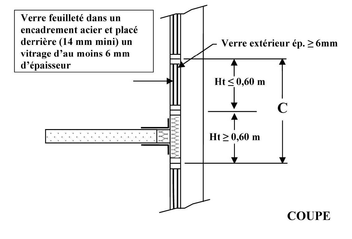 La hauteur maximale d'un tel vitrage participant à l'indice C doit être inférieure ou égale à 0,6 mètre. Ce vitrage isolant doit être maintenu dans un encadrement en acier présentant une hauteur de feuillure de 20 mm.