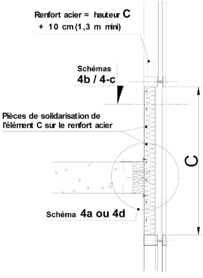 - soit par un renfort acier. Les éléments formant le C, de part et d'autre du renfort de l'ossature de façade, doivent être reliés à celui-ci (schémas 4-b et 4-c) par des pièces de solidarisation en acier. L'étanchéité aux fumées et gaz chauds à chaque liaison ossature-remplissage doit être réalisée.