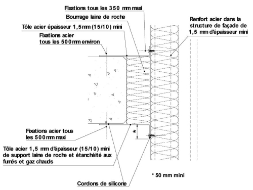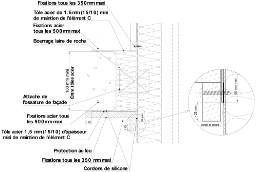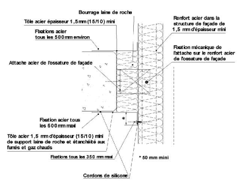 - l'attache de l'ossature de façade à la structure du bâtiment, dans le cas du schéma 4-a, y compris le renfort, doit être en acier et protégée en sous-face par un calfeutrement de laine minérale de roche sur au moins 50 mm d'épaisseur, lui-même maintenu par une tôle d'acier de 1,5 mm d'épaisseur ;