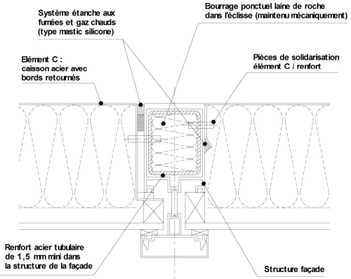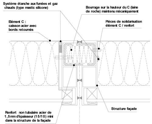- il convient de prévoir, dans les montants et traverses situés dans la hauteur du C des profilés aluminium, des renforts intérieurs en acier liaisonnés entre eux mécaniquement. Ces renforts doivent être liaisonnés au gros oeuvre. L'« EdR feu » assurant le C devra être solidarisé par un dispositif en acier aux renforts ;