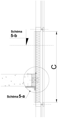 En partie supérieure de la hauteur C, afin d'éviter un effet de cheminée dans les profilés, l'ossature doit comporter un bourrage ponctuel en laine minérale de roche maintenu mécaniquement (schéma 4-c). Si le renfort acier est un profilé à section ouverte (non tubulaire), le bourrage en laine minérale de roche doit être réalisé sur toute la hauteur du C (schéma 4-b).