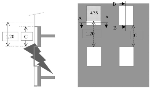 - l'ossature aluminium doit comporter un renfort acier, d'épaisseur minimale de 1,5 mm, sur toute la hauteur C augmentée de 0,10 m. Si l'ossature est en acier, cette disposition ne s'applique pas car les profilés assurent la stabilité mécanique d'ensemble. Au dernier niveau, la stabilité de l'ossature de façade est assurée soit en doublant les fixations afin de limiter la rotation (minimum tous les 200 mm), soit en augmentant la longueur du renfort dans l'ossature de 0,4 m minimum ;