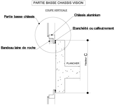 La traverse basse du châssis vision doit être protégée soit par la présence d'un profilé tubulaire en aluminium (ex. : traverse haute du châssis inférieur située devant l'allège), soit par le bandeau en laine minérale de roche indiqué au paragraphe 2.1.2.2.