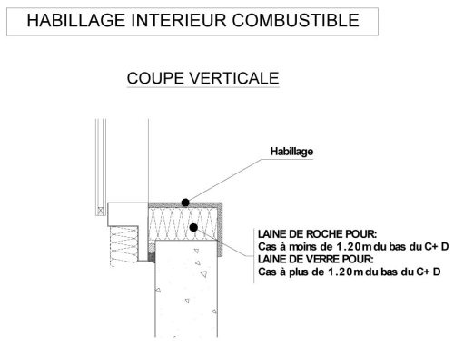 A moins de 1,20 m du point de sortie des flammes, les habillages combustibles de tableaux intérieurs doivent être protégés de l'échauffement potentiel des menuiseries aluminium par un isolant thermique en laine minérale de roche (figure 8).