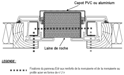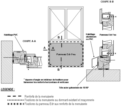 - il convient de prévoir, dans les montants et traverses situés dans la hauteur du C des profilés PVC, des renforts intérieurs en acier liaisonnés entre eux mécaniquement. Ces renforts doivent être liaisonnés au gros oeuvre. L'« EdR feu » assurant le C devra être solidarisé par un dispositif en acier aux renforts ;