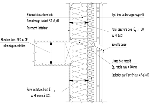 Un complément d'isolation A2-s3, d0 peut être ajouté par l'extérieur entre le panneau de fermeture de l'élément à ossature bois ou l'élément bois monobloc et le système de bardage (exemples figures 18 à 22).
