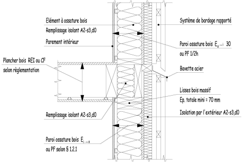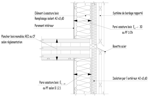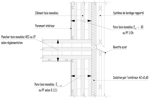 La tenue au feu des liaisons façade-plancher et des éléments à ossature bois et bois monobloc est justifiée pour le degré de stabilité au feu requis pour la structure.