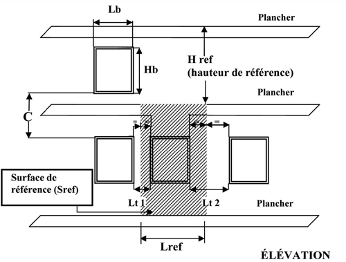 Lref : largeur de référence égale à la largeur de baie (Lb) augmentée de part et d'autre d'une largeur égale à la moitié de la largeur de chaque trumeau (½ Lt1, ½ Lt2). Chacune de ces deux valeurs (½ Lt1, ½ Lt2) est limitée à la valeur de la hauteur de la baie (Hb) divisée par 4.
