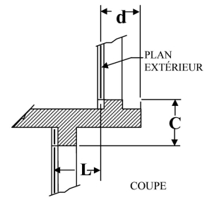 Pour pouvoir prendre en compte la hauteur d'une allège dans le calcul de C, le retrait R ne devra pas excéder 0,20 m, mesuré par rapport au nu du vitrage intérieur. De plus, les vitrages superposés doivent être maintenus en partie haute de l'allège. La tenue du vitrage supérieur ne doit pas être subordonnée à la tenue de la façade située sous la coupure.