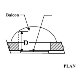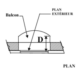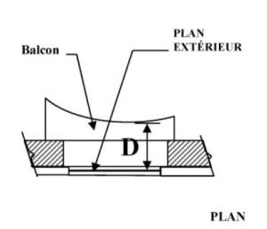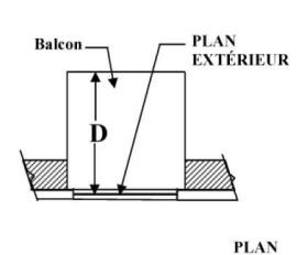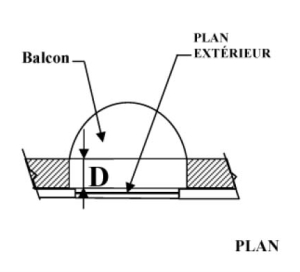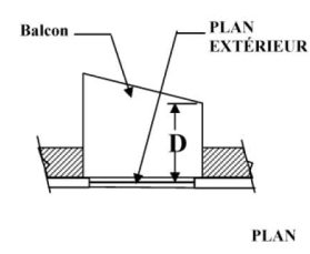 En présence d'un balcon ou d'une avancée, placés devant une baie et répondant aux exigences du paragraphe 1.2.2. D est la plus courte distance mesurée au droit de la baie, perpendiculairement à la façade.