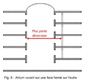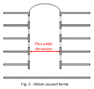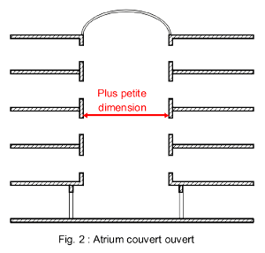 La plus petite dimension d'un atrium est définie comme étant le diamètre du cylindre droit s'inscrivant sur toute la hauteur de l'atrium, dans l'espace libre compris entre :