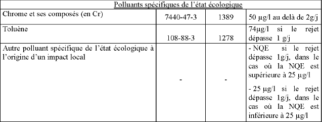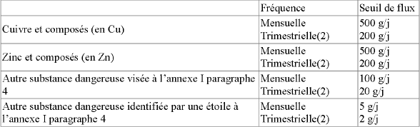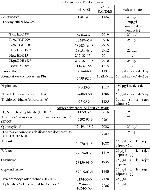 Les substances dangereuses marquées d'une * dans le tableau ci-dessus sont visées par des objectifs de suppression des émissions et doivent en conséquence satisfaire en plus aux dispositions de l'article 22-2-III de l'arrêté du 2 février 1998 modifié.