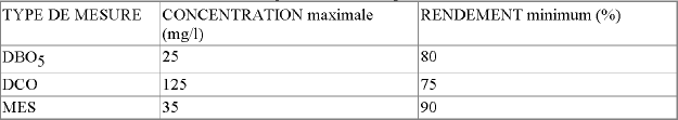 Sur un échantillon moyen journalier et conformément aux dispositions de l'article 27, les eaux résiduaires rejetées au milieu naturel respectent soit les valeurs limites de concentration soit les valeurs limites en rendement définies par le tableau ci-après :
