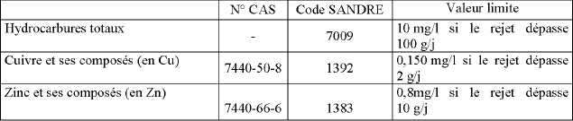 Par ailleurs, pour toutes les autres substances susceptibles d'être rejetées par l'installation, les eaux résiduaires rejetées au milieu naturel respectent les valeurs limites de concentration suivantes :
