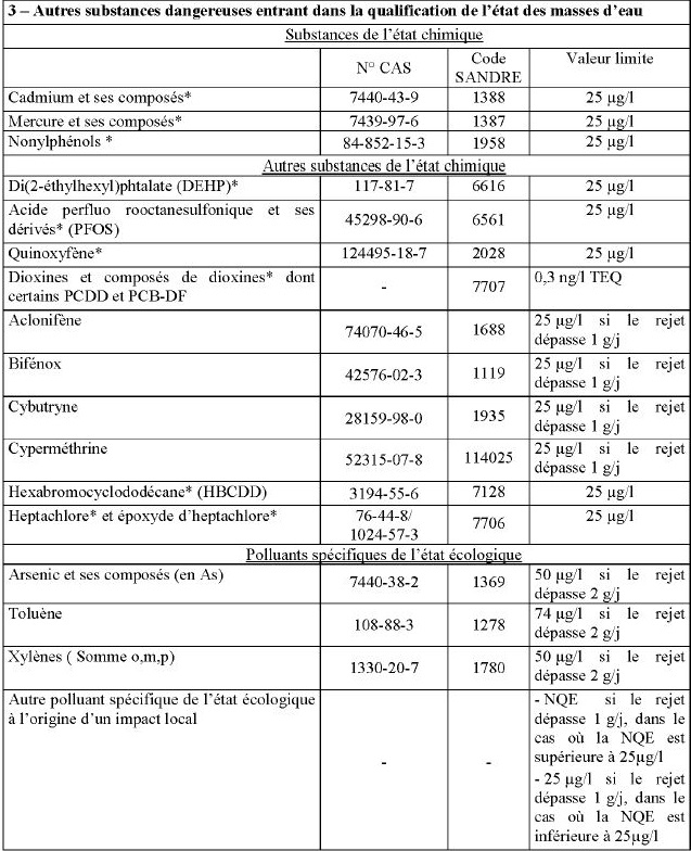 Les substances dangereuses marquées d'une * dans le tableau ci-dessus sont visées par des objectifs de suppression des émissions et doivent en conséquence satisfaire en plus aux dispositions de l'article 22-2-III de l'arrêté du 2 février 1998 modifié.
