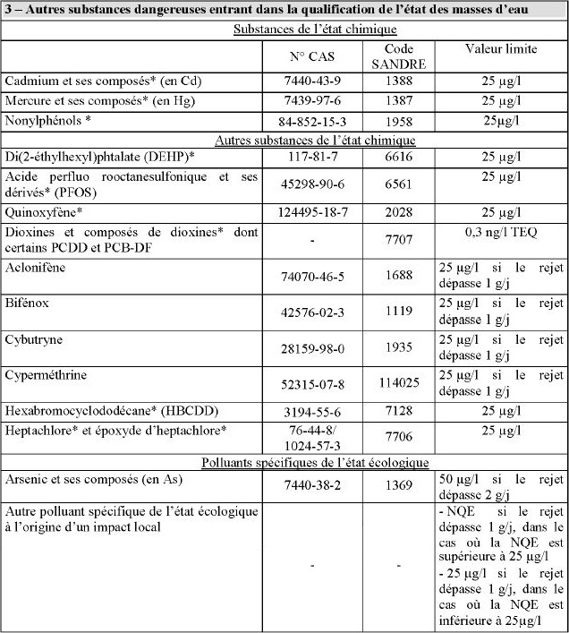 Par ailleurs, pour toutes les autres substances susceptibles d'être rejetées par l'installation, les eaux résiduaires rejetées au milieu naturel respectent les valeurs limites de concentration fixées suivantes. Les rejets respectent les valeurs limites de concentration suivantes :