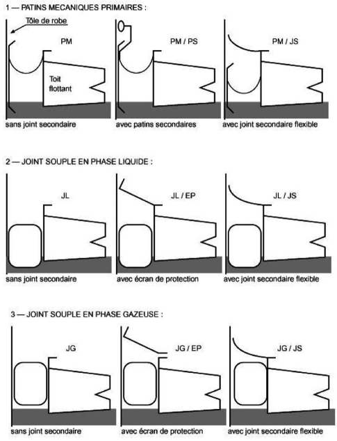 - réservoir à toit flottant : réservoir muni d'un toit métallique mobile conçu pour que sa flottabilité soit assurée, et muni d'un joint annulaire d'étanchéité ;