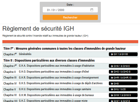 "HistoriqueApercu de l'historique IGH " : versions antérieures du règlement de sécurité IGHImmeubles de grande et moyenne hauteur depuis 1967(saisir une date : permis de construire, travaux... et accéder en un clic à la version consolidée du règlement applicable à la date saisie) |