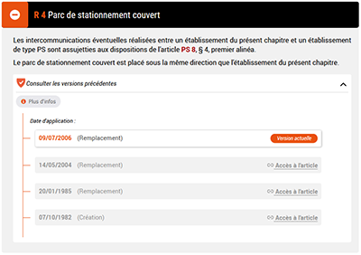 "HistoriqueApercu de l'historique ERP " : versions antérieures du règlement de sécurité ERPÉtablissements Recevant du Public depuis 1954(saisir une date : permis de construire, travaux... et accéder en un clic à la version consolidée du règlement applicable à la date saisie) |